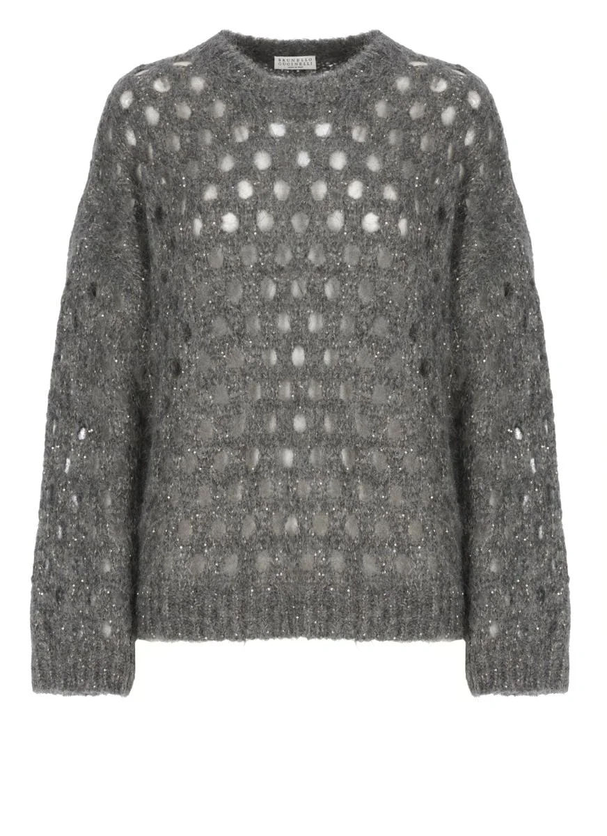 - Grey Cucinelli sweater for woman - Crew neck - Long sleeves - All-over sequins details Model's height is 179 cm and she wears a size S Gender: Women Material: 54% MOHAIR 26% POLYAMIDE 15% POLYESTER 5% WOOL Color: GREY Made in: Italy Product ID: MNA326500CGD77 *Import tax/duty will be calculated at checkout (If applicable)