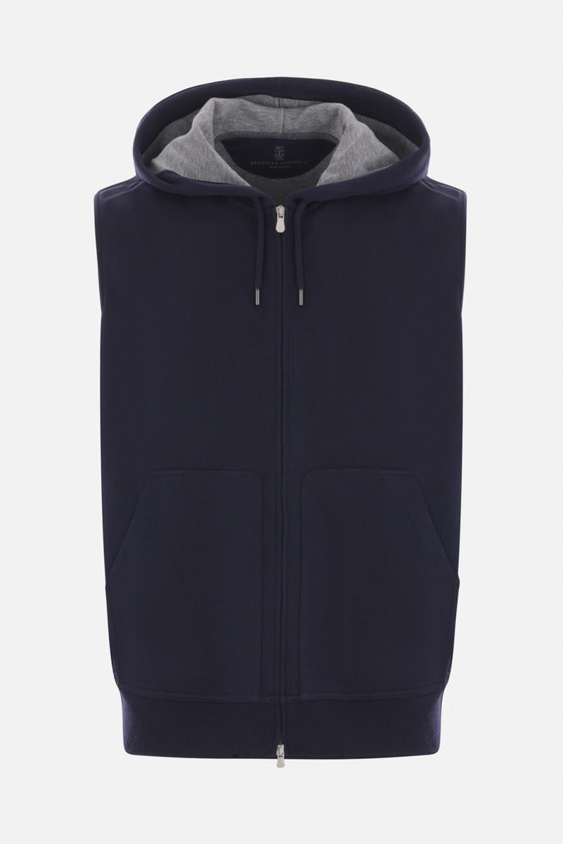 Brunello Cucinelli sleeveless hoodie made of blue cotton, cashmere, and silk jersey. It features a front double-slider zip closure, kangaroo pockets, ribbed hem and contrast interior. Gender: Men Material: 65%COTTON 24%POLYAMIDE 7%CASHMERE 4%SILK Color: BLUE Made in: IT Product ID: MM8319079GC1265 *Import tax/duty will be calculated at checkout (If applicable)