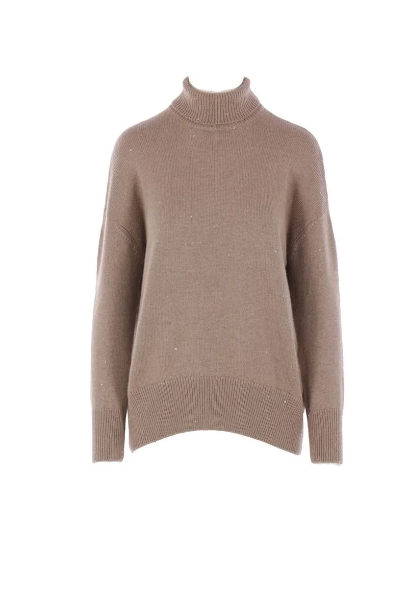 Brunello Cucinelli turtleneck made of dark beige cashmere and silk knit with tone-on-tone sequins embroidered all over. Featuring a high neck, long sleeves, and ribbed trims. Gender: Women Material: (T112) 80%CASHMERE 20%SILK Color: BROWN Made in: Italy Product ID: M73539914CJ077 *Import tax/duty will be calculated at checkout (If applicable)