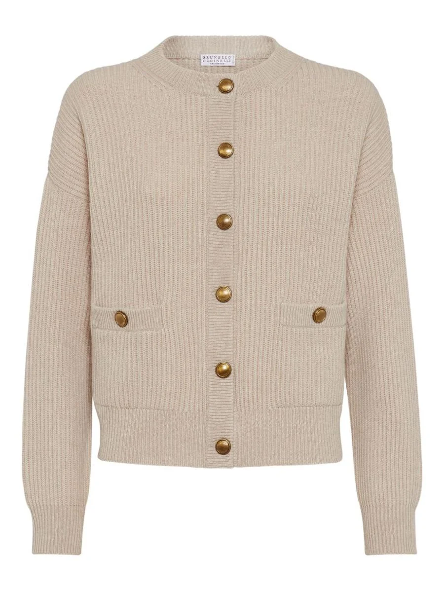 Virgin wool, cashmere and silk English rib cardigan with metal buttons