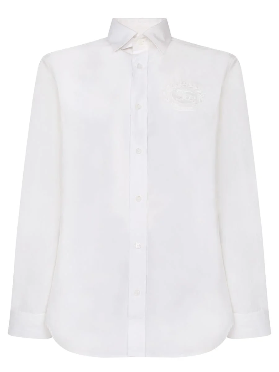 Long-sleeved white cotton shirt. Classic collar. Front button closure. Embroidered Knight logo on the chest. This elegant Burberry shirt features a discreetly embroidered Knight logo on the chest, adding a touch of sophistication. Perfect for both formal occasions and as part of a casual chic outfit. Gender: Men Material: 100% COTTON Color: BROWN Made in: Imported Product ID: 8095333 B7347 *Import tax/duty will be calculated at checkout (If applicable)