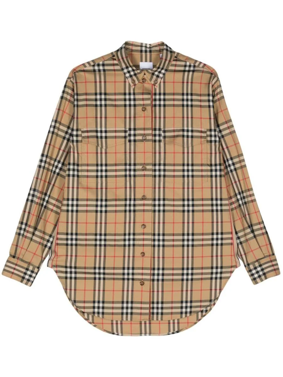 archive beige Vintage Check pattern stretch-cotton button-down collar front button fastening long sleeves buttoned cuffs curved hem This piece fits true to size. We recommend you get your regular size Model is 1,75m / 5ft 8in wearing size 8 (UK) Gender: Women Material: COTTON 95%, ELASTANE 5% Color: BEIGE Made in: TH Product ID: 8083146A7028 *Import tax/duty will be calculated at checkout (If applicable)