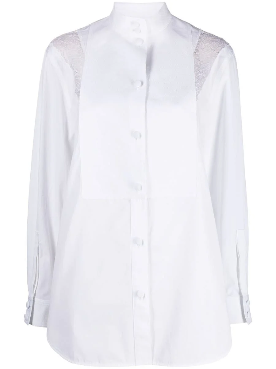 lace-panel detail poplin shirt from BURBERRY featuring lace detailing, white, cotton, band collar, front button fastening, long sleeves and straight hem. This piece fits true to size. We recommend you get your regular size Model is 1,75m / 5ft 8in wearing size 8 (UK) Gender: Women Material: COTTON 100%, VISCOSE 50%, POLYAMIDE 50% Color: WHITE Made in: PL Product ID: 8071316A1462 *Import tax/duty will be calculated at checkout (If applicable)