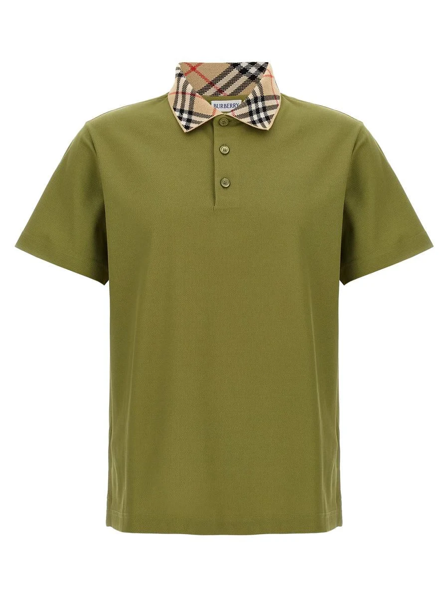 'For' cotton pique polo shirt, Burberry Check print collar and buttons, short sleeves, side slits Gender: Men Material: 100% COTTON Color: GREEN Made in: Portugal Product ID: 8110946ESTATE *Import tax/duty will be calculated at checkout (If applicable)