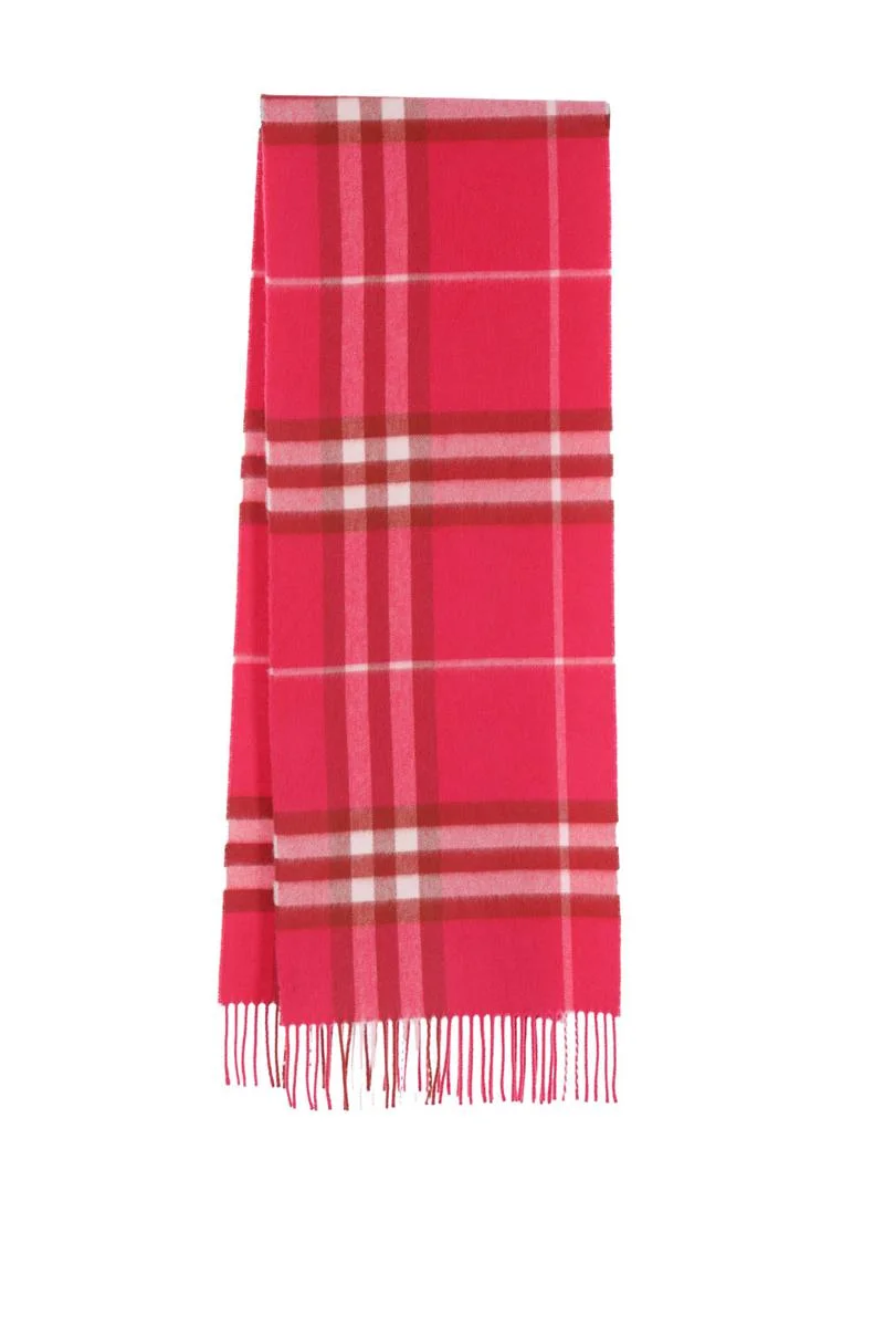 Burberry scarf crafted from cashmere in fuchsia Giant Check pattern. Featuring fringed ends on both sides. Gender: Women Material: 100%CASHMERE Color: JAM PINK Made in: Greece Product ID: 8112709C3270 *Import tax/duty will be calculated at checkout (If applicable)