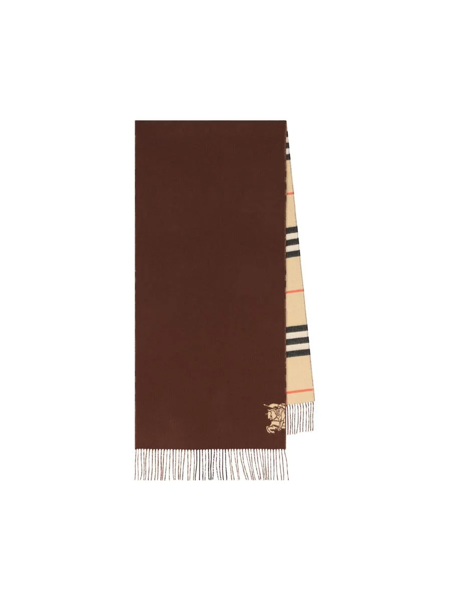Made in a historic Scottish mill founded in 1797, this pure cashmere scarf offers a reversible design: on one side the iconic Burberry Check pattern, on the other a solid color embellished with Equestrian Knight Design jacquard embroidery. Traditional processing involves washing in local spring water and brushing with dry thistles to achieve a natural luster and extraordinary softness to the touch. - Composition: 100% cashmere - Color: Sand - Details: Rectangular pattern; Reversible design; Fringes at the ends; Burberry Check on one side; Solid color with Equestrian Knight Design in jacquard on the other side - Item code: 8113931A2021 Gender: Women Color: Beige Made in: Imported Product ID: 8113931A2021_AI25 *Import tax/duty will be calculated at checkout (If applicable)