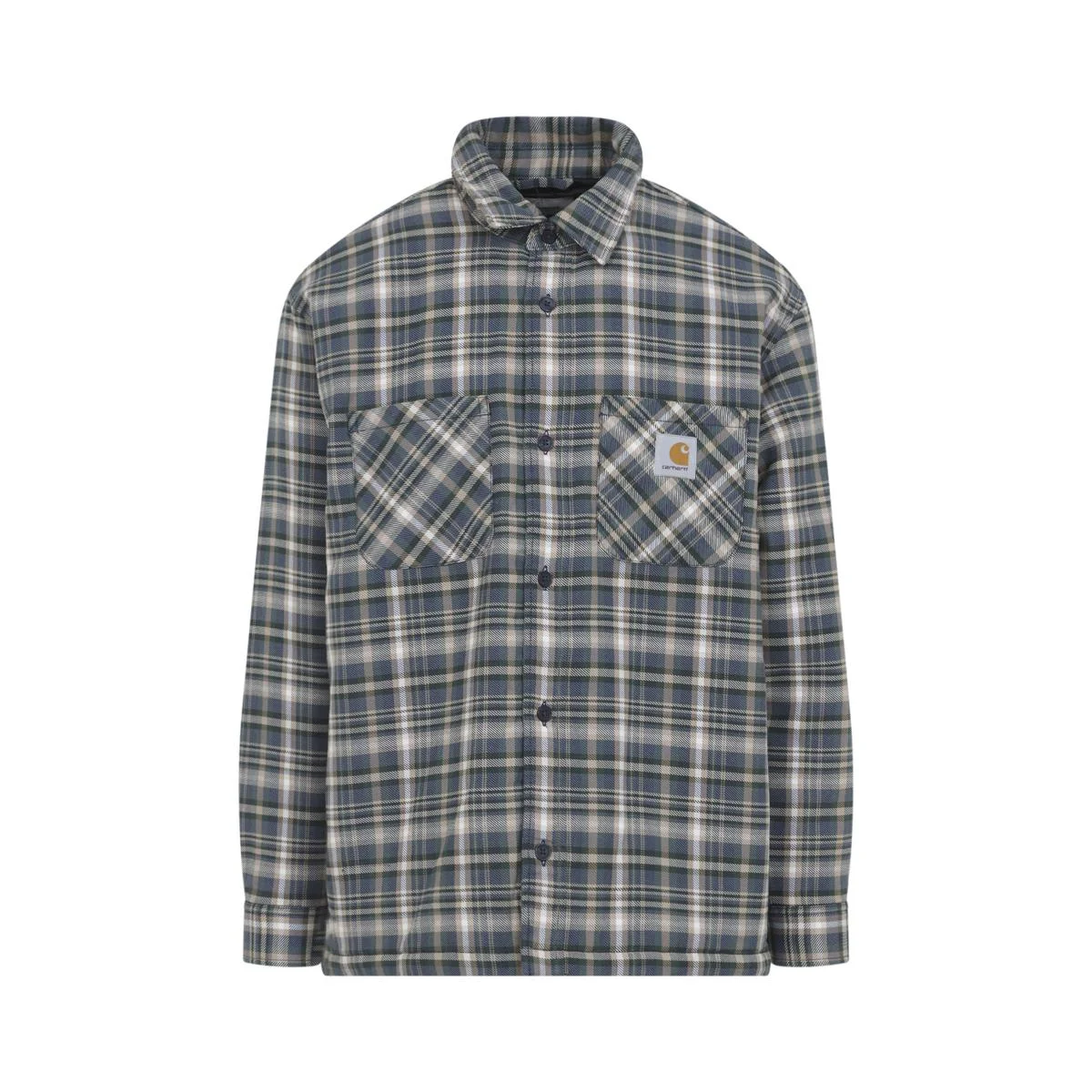 Carhartt Wip Cronyn Dark Navy Cotton Shirt Jacket. Crafted from blue-toned checkered cotton blend twill, shirt collar, front button fastening, patch pockets with logo label detail on the chest, two side pockets, long sleeves with adjustable cuffs, quilted pattern lining, straight hem. Gender: Men Material: 65%COTTON 35%POLYESTER Color: BLUE Made in: Imported Product ID: I03531235RXX_ *Import tax/duty will be calculated at checkout (If applicable)
