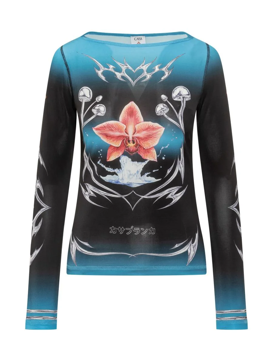 Casablanca long-sleeved top in lightweight jersey with floral print and contrasting graphic details. Gender: Women Material: 95% VISCOSE, 5% ELASTANE Color: Black Made in: Portugal Product ID: AW25JTP40401 01 *Import tax/duty will be calculated at checkout (If applicable)