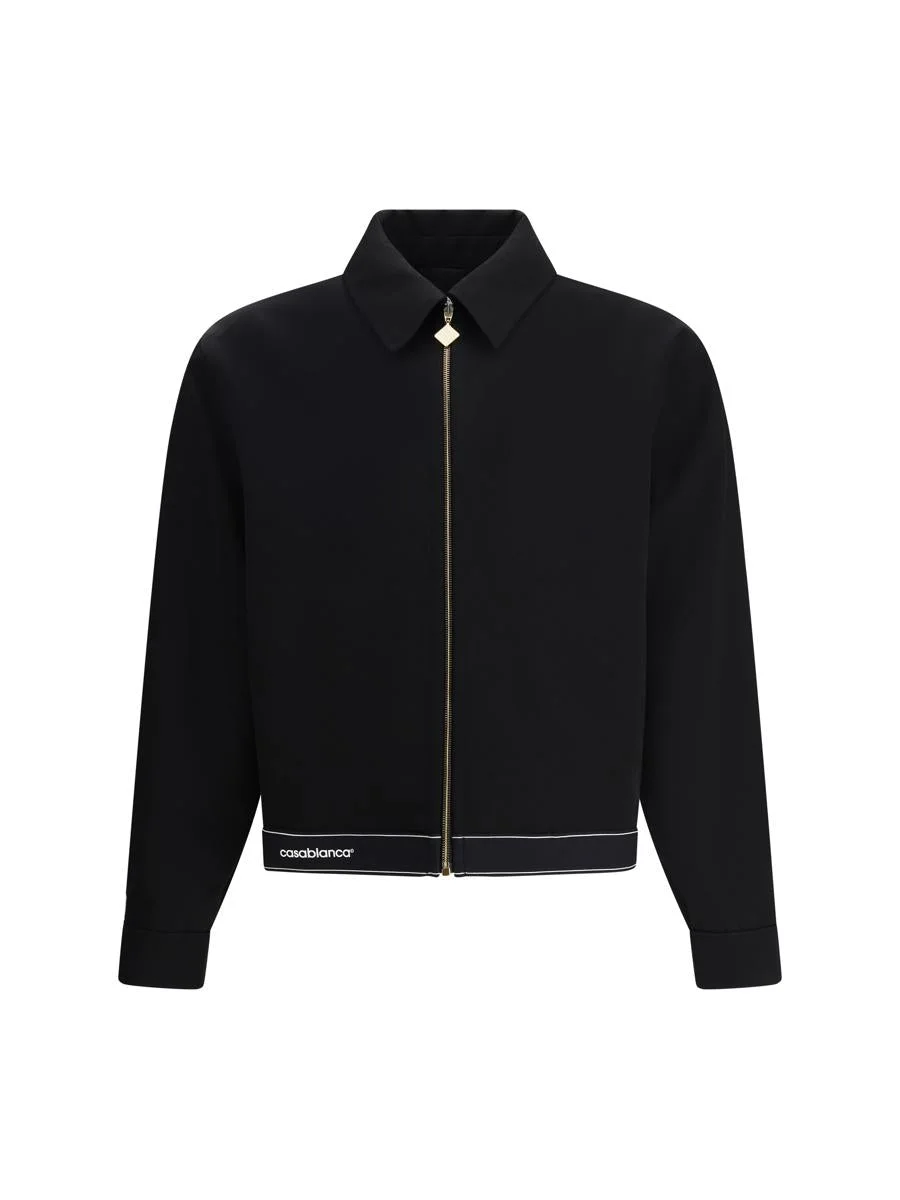 CASABLANCA'S WOOL SPORTS JACKET FEATURES A SLEEK, MODERN DESIGN THAT'S PERFECT FOR A CASUAL YET POLISHED LOOK. IT FEATURES A POINTED COLLAR AND A LOGO-EMBOSSED ZIPPER FRONT CLOSURE THAT ADDS A DISTINCTIVE, CONTEMPORARY TOUCH. THE DROPPED SHOULDERS AND RELAXED FIT ENSURE COMFORT AND A SOFT SILHOUETTE, WHILE THE LONG SLEEVES ARE FINISHED WITH BUTTONED CUFFS FOR A CLASSIC DETAIL. THE EMBROIDERED LOGO ON THE FRONT HEM EMPHASIZES THE BRAND'S IDENTITY, WHILE WHITE PIPING ON THE BOTTOM ADDS ELEGANT CONTRAST. TONE-ON-TONE VISCOSE LINING COMPLETES THE JACKET, ENSURING A SOFT, QUALITY FEEL. RTW IT Gender: Men Material: WOOL Color: Black Made in: Portugal Product ID: MPF25JK42501_BLACK *Import tax/duty will be calculated at checkout (If applicable)