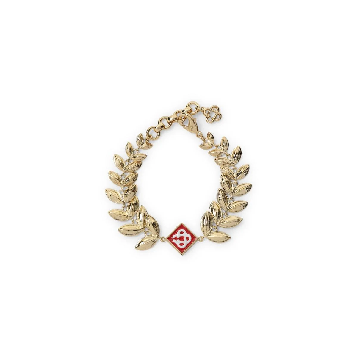 Casablanca Laurel Gold Brass Bracelet. Golden-finish brass, red enameled logo, golden-toned Laurel-chain all around, lobster clasp fastening, logo charm detail, adjustable fit. Gender: Men Material: 100%BRASS Color: GREY Made in: Imported Product ID: APF25JW25401_ *Import tax/duty will be calculated at checkout (If applicable)