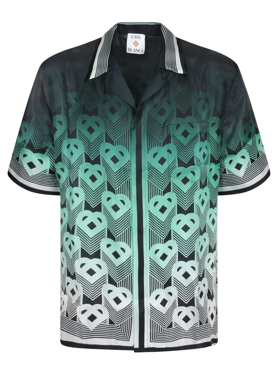 Short sleeves. Pointed collar. Front button closure. This Casablanca shirt features a bold green and black gradient monogram design, offering a distinctive and contemporary look. Perfect for adding a touch of modern elegance to your wardrobe. Gender: Men Material: 100% SILK Color: Multicolor Made in: Imported Product ID: MPF25SH003 04 *Import tax/duty will be calculated at checkout (If applicable)