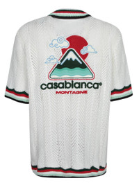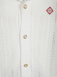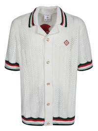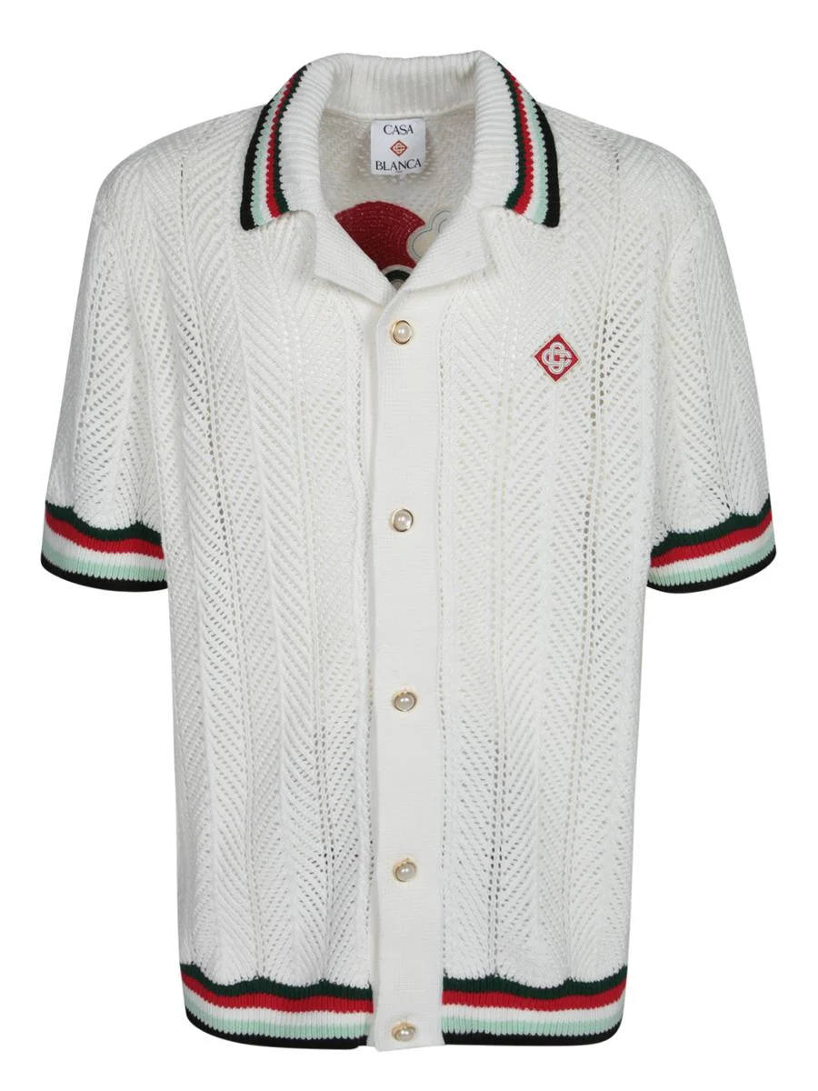 Short sleeve shirt. Polo collar with striped details. Front button closure. Elegant CASABLANCA faux crochet knit shirt, adorned with contrasting edges and chest logo embroidery, perfect for a distinctive and sophisticated look. Gender: Men Material: 100% COTTON Color: Multicolor Made in: Imported Product ID: MPF25KW996 01 *Import tax/duty will be calculated at checkout (If applicable)