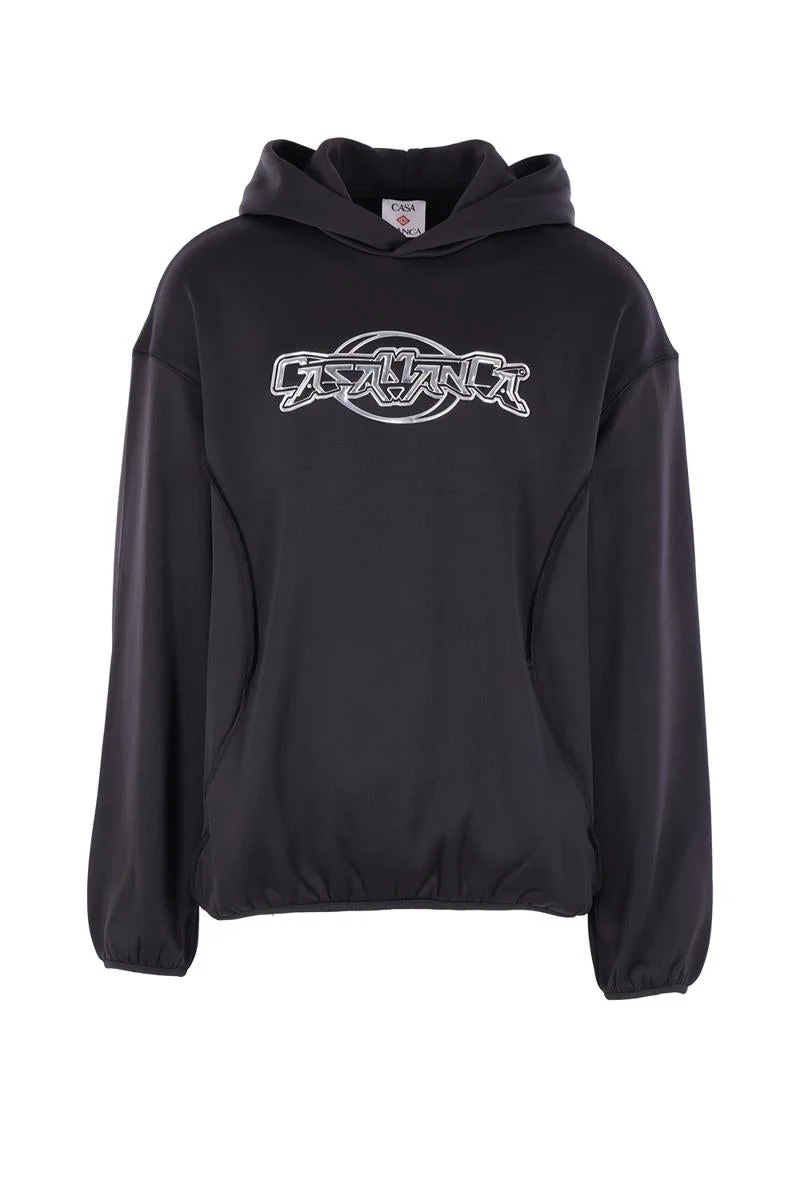 Casablanca oversized hoodie crafted from black technical jersey with metal warped logo. Featuring a stitched panel detail, long sleeves, side pockets, and elasticated trims. Gender: Men Material: MAIN: 100% POLYAMIDE CONTRAST: 49% POLYESTER, 37% ELASTANE, 14% POLYAMIDE Color: Black Made in: Portugal Product ID: AW25JTP42601 *Import tax/duty will be calculated at checkout (If applicable)