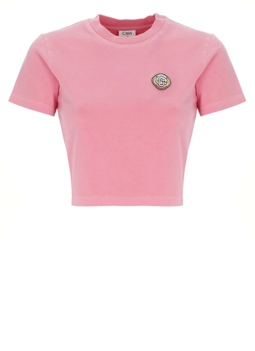 - Pink Casablanca cotton t-shirt for woman - Roud neckline - Short sleeves - Front logoed patch Model's height is 179 cm and she wears a size S Gender: Women Material: 95% ORGANIC COTTON 5% ELASTANE CONTRAST: 100% ORGANIC COTTON APPLIQUE: 95% VISCOSE 5% ETHILENE VINYL ACETATE Color: PINK Made in: Portugal Product ID: WAW25JTS00901PINK *Import tax/duty will be calculated at checkout (If applicable)