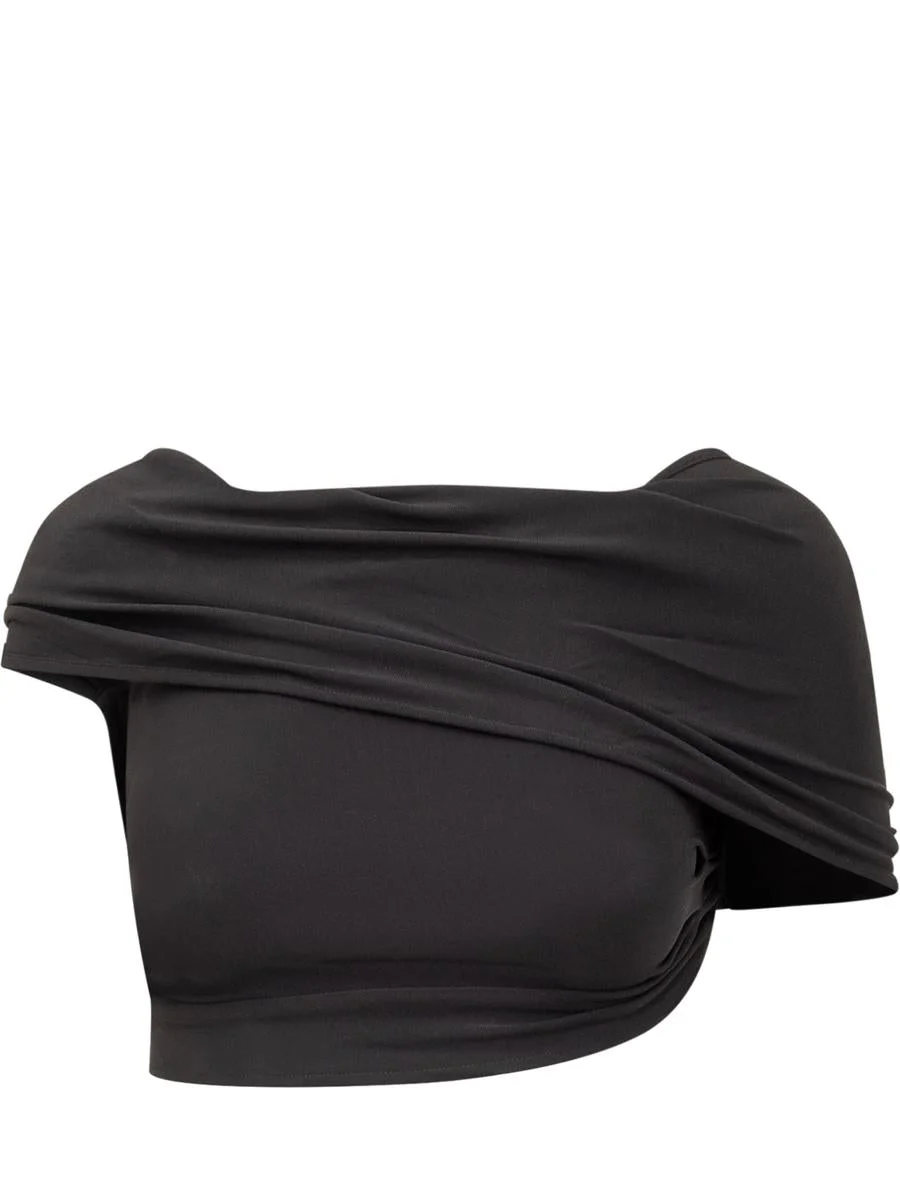 - Casablanca - Draped cropped top - Stretch - Black - Crew neck design - Sleeveless - Cap sleeves - Ruching detail - Square back neckline - Asymmetrical hem - Women’s SizeAndFit: Length: 30.5 Centimetres WAIST: 61.0 Centimetres BUST: 63.5 Centimetres Gender: Women Material: 97% VISCOSE 3% ELASTANE Color: Black Made in: PT Product ID: WF24TP063 01 *Import tax/duty will be calculated at checkout (If applicable)
