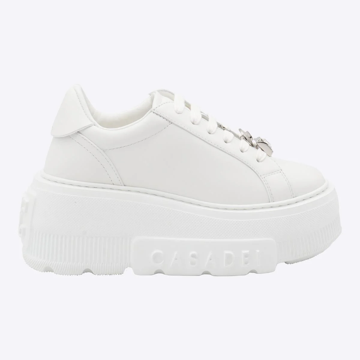White leather sneakers from Casadei featuring round toe, cotton laces, oversize sole and lateral logo. Size Type: Shoes Woman IT Gender: Women Material: COVER 100%LE SOLE 100%ELASTANE Color: WHITE Made in: Italy Product ID: 2X081A0701C17959999 *Import tax/duty will be calculated at checkout (If applicable)