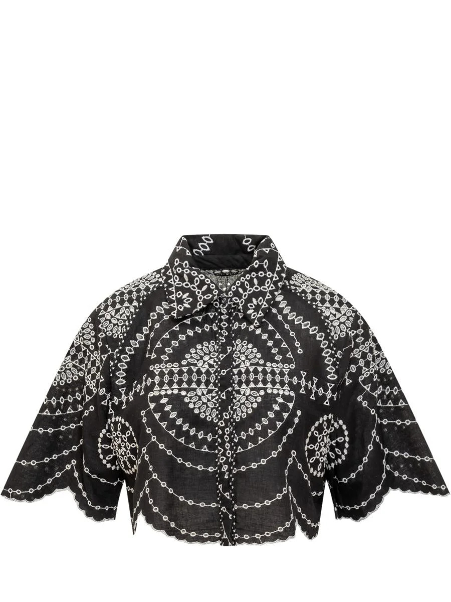 Button closure. Pointed collar. Short flared sleeves. Cropped cut. Boxy fit. Contrasting embroidery details. Gender: Women Material: 60% COTTON, 20% POLYESTER, 20% LINEN Color: Black Made in: Portugal Product ID: 254200 BLACK *Import tax/duty will be calculated at checkout (If applicable)