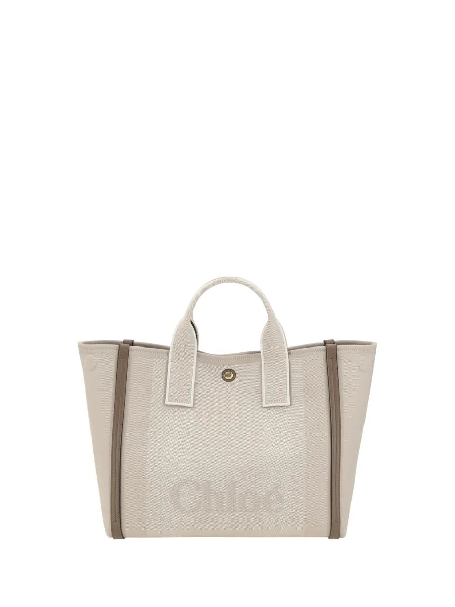 THE CARRY HANDBAG FROM CHLOE IS A REFINED AND VERSATILE ACCESSORY, CRAFTED FROM COTTON WITH CONTRASTING LEATHER DETAILS THAT ACCENTUATE ITS ELEGANCE. THE TOP SNAP CLOSURE PROVIDES PRACTICALITY, WHILE THE DOUBLE FLAT HANDLES AND LEATHER EXTENSION ON THE SIDE PANELS ADD A SOPHISTICATED TOUCH. THE BRAND'S ICONIC MONOGRAM IS VISIBLE ON THE FRONT AND BACK, CREATING A DISTINCTIVE APPEAL. THE REMOVABLE AND ADJUSTABLE LEATHER SHOULDER STRAP ALSO ALLOWS IT TO BE CARRIED ON THE SHOULDER, INCREASING VERSATILITY. INSIDE, A WELT POCKET HELPS KEEP SMALLER ITEMS TIDY, WHILE THE BRAND'S SIGNATURE ON THE SIDE PANELS COMPLETES THE LOOK WITH A CLASSY DETAIL. UNI Height: 29 cm, Length: 40 cm, Depth: 16 cm Gender: Women Material: COTTON | POLYESTER | OTHER FIBRES Color: Beige Made in: IT Product ID: CHC25SS910O65_23N *Import tax/duty will be calculated at checkout (If applicable)