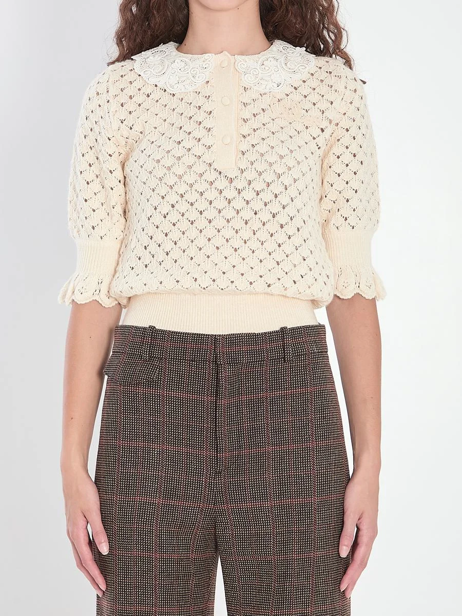 Ivory open-knit pullover made from a cotton and wool blend. Features an embroidered logo on the chest, a rounded lace collar, a three-button front closure, short sleeves, and ribbed trims. The model is 178 cm tall and wears a size S. Size nationality: INT Gender: Women Material: 72% COTTON, 17% ALPACA WOOL, 11% SILK; RIB: 68% COTTON, 17% ALPACA WOOL, 10% SILK, 4% POLYAMIDE, 1% ELASTANE Color: Beige Made in: Italy Product ID: 855423 CH25AMP47590 107 *Import tax/duty will be calculated at checkout (If applicable)