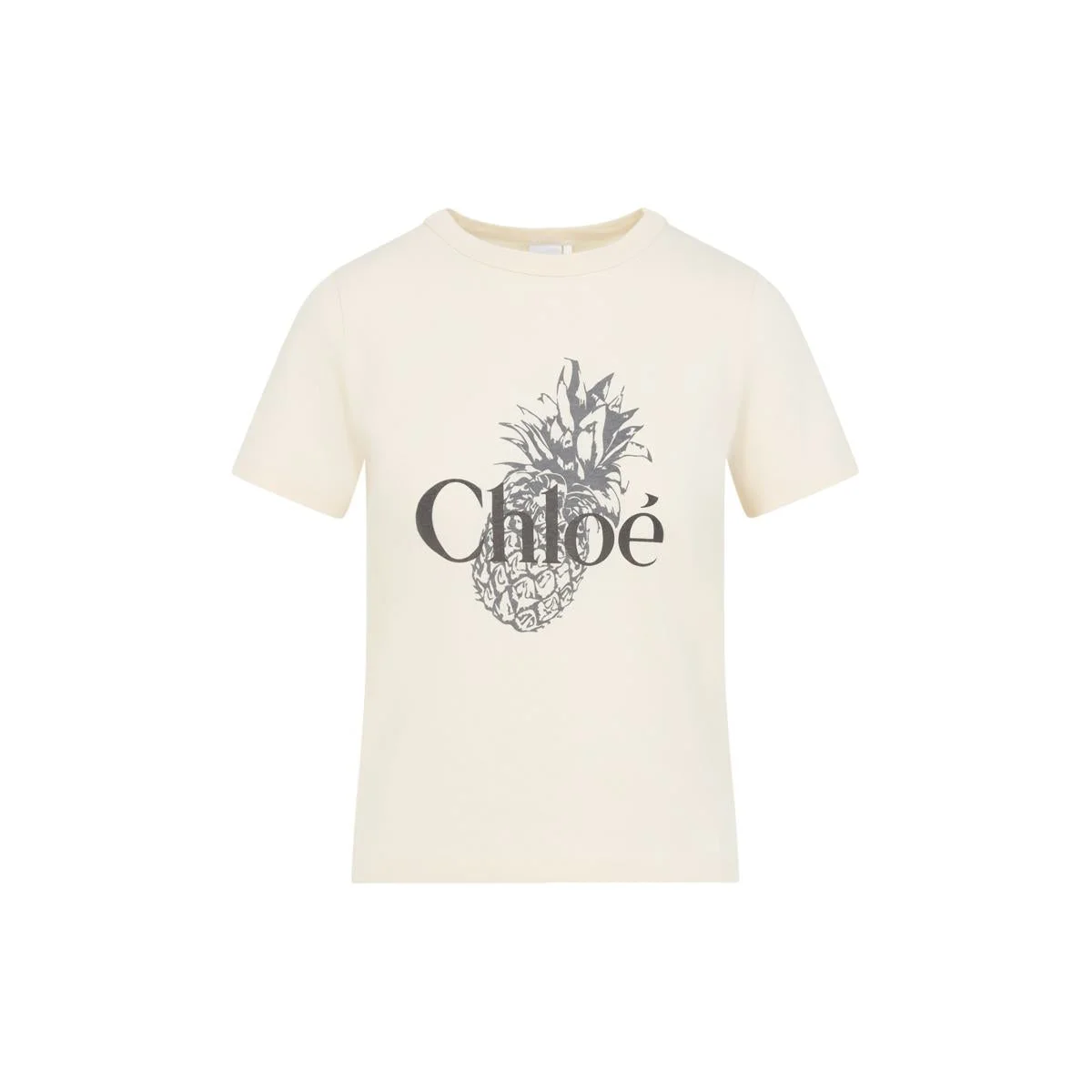 Chloe Tender Peach Beige Cotton T-Shirt. Pure tender peach beige cotton t-shirt, round neck, front contrasting grey design, short sleeves, straight hem, tonal stitching. Gender: Women Material: 100%COTTON Color: Beige Made in: Portugal Product ID: CH25AJH11170_61 *Import tax/duty will be calculated at checkout (If applicable)