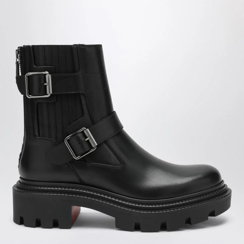 Black leather biker boots by Christian Louboutin with round toe, zip closure at the back, and adjustable straps at the front. Red Loubi rubber sole. Gender: Women Material: 100% Leather / Rubber sole Color: Black Made in: Italy Product ID: 3250625LE/R_LOUBO-BK01 *Import tax/duty will be calculated at checkout (If applicable)