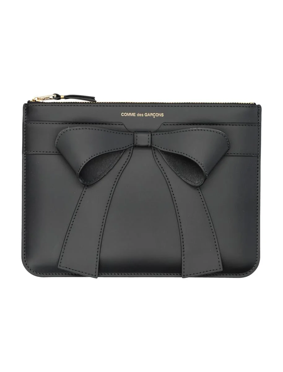 Big bow leather pouch by Comme Des Garcons Wallet. Featuring: Zip closure Tonal bow at front Logo print Main compartment Gold-tone metal finish Height: 16,5 cm Width: 22,5 cm Gender: Women Material: 100% LEATHER Color: Black Made in: Spain Product ID: 25ASA5100BB#1 *Import tax/duty will be calculated at checkout (If applicable)