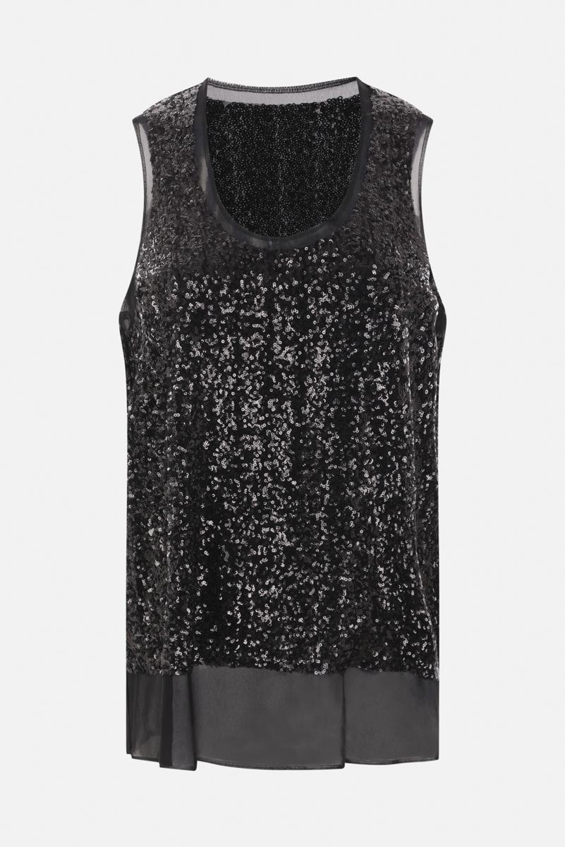 Comme des Garcons' sleeveless top crafted in black georgette entirely embroidered with tone-on-tone sequins. It features crew neck and straight hem. Gender: Women Material: POLYESTER 90% POLYURETHANE 10% ATTACH: POLYESTER 100% Color: BLACK + BLACK Made in: JP Product ID: GNB019W241BLACKXBLACK *Import tax/duty will be calculated at checkout (If applicable)