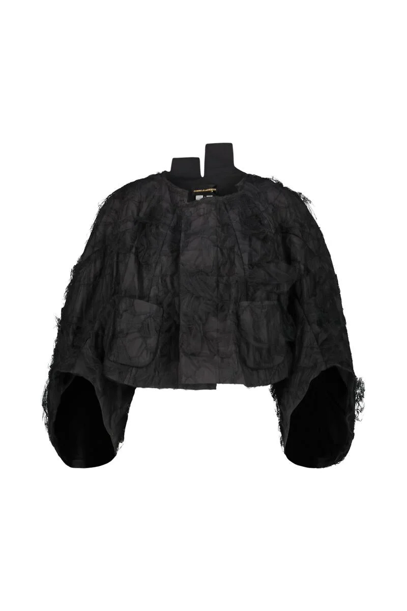 Comme des Garçons cropped jacket in textured fabric with layer of irregularly stitched tulle with relief effect, wide three-quarter sleeves with rounded volume, hook closure Gender: Women Material: NYLON | 100%NYLON Color: Black Made in: JP Product ID: GMJ025S24 *Import tax/duty will be calculated at checkout (If applicable)