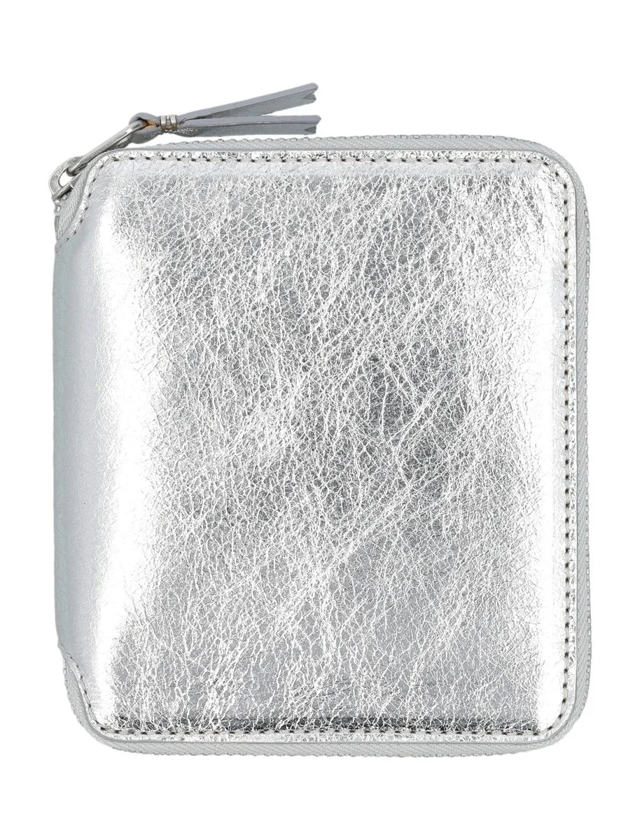 Leather Metallic zip around wallet by Comme Des Garcons Wallet. Featuring: Metallic effect Zip around fastening Interior card slots Interior flap pocket for coins Interior embossed logo Heigth: 12cm Width: 10,5cm Depth: 1,5cm Gender: Women Material: 100% CALFSKIN Color: SILVER Made in: Spain Product ID: 25ASA2100G#2 *Import tax/duty will be calculated at checkout (If applicable)