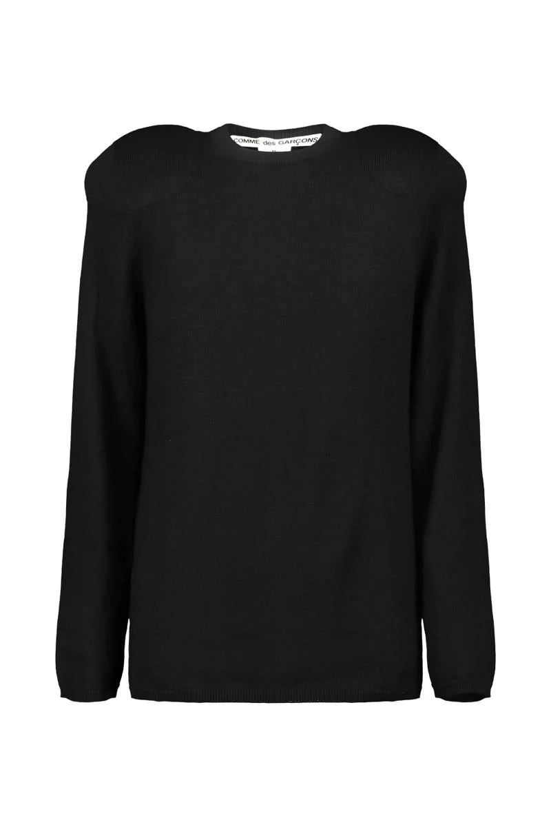 Comme des Garcons crew neck wool sweater with exaggerated padded shoulder detail. Gender: Women Material: WOOL | 100% WOOL Color: Black Made in: Imported Product ID: GP N003 W25 *Import tax/duty will be calculated at checkout (If applicable)