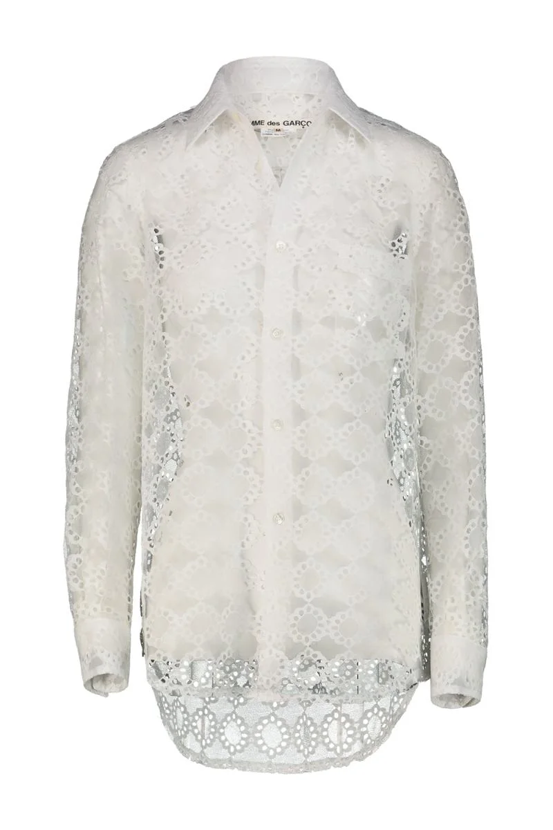 Comme des Garcons white shirt with long sleeves in technical San Gallo lace, patch pocket on the front, rounded on the bottom. Gender: Women Material: COTTON | 56% COTTON 44% NYLON Color: WHITE Made in: Imported Product ID: GO B013 *Import tax/duty will be calculated at checkout (If applicable)