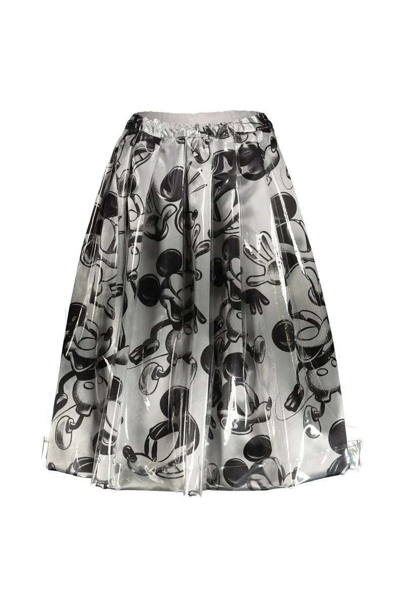 Comme des Garçons wide Mickey-Mouse print skirt featuring a high-waisted elasticated waistband with hidden string fastening and a shine finish rendered through an overlaid clear plastic film. Gender: Women Material: 100% POLYESTER Color: WHITE Made in: JAPAN|JP Product ID: GGS011051 *Import tax/duty will be calculated at checkout (If applicable)