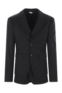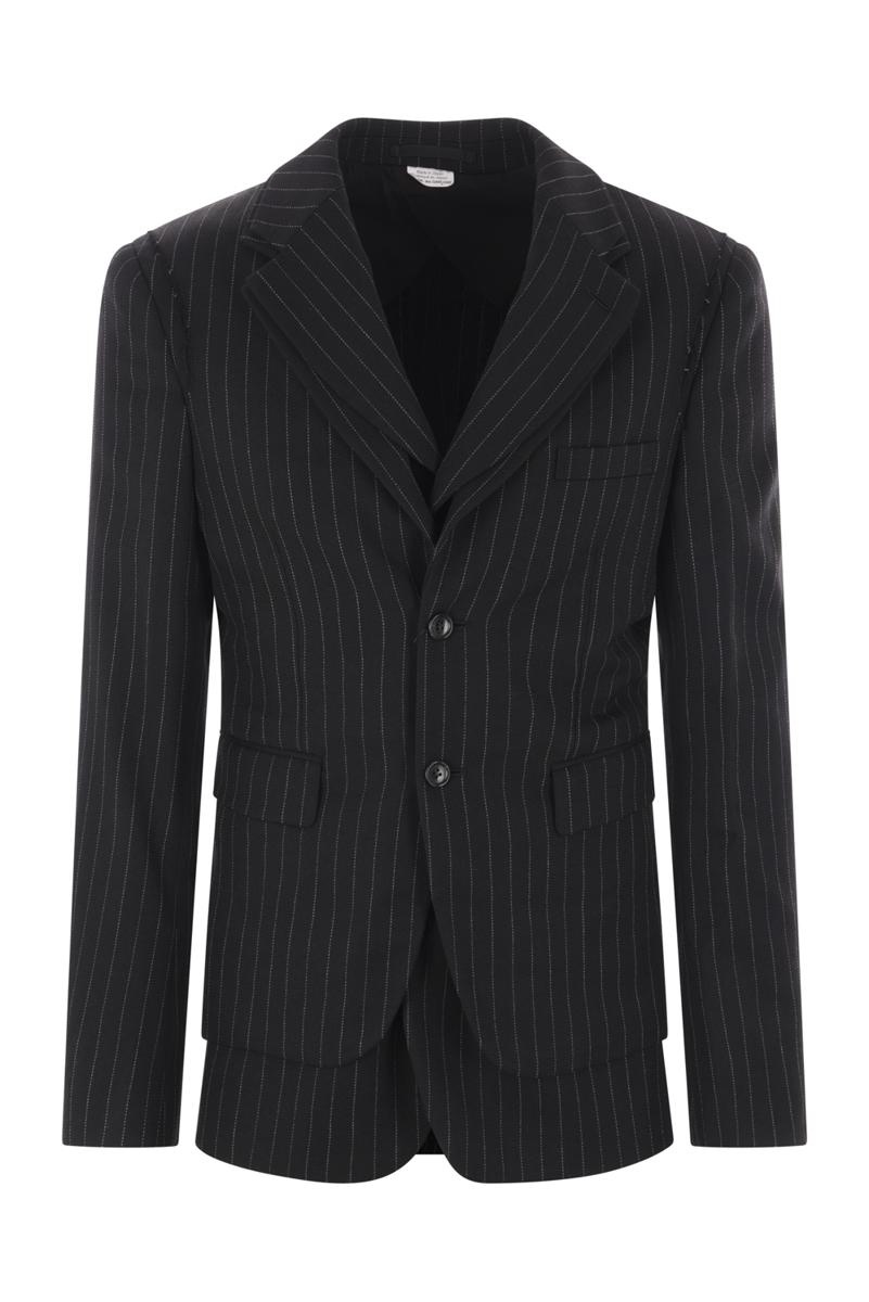 CDG Homme Plus single-breasted jacket made with a double-layered pinstripe wool structure. It features classic lapels, button closure, front flap pockets, long sleeves with buttoned cuffs and a straight hem with a back vent. It is partially lined. Gender: Men Material: WOOL 98% POLYURETHANE 2% Color: Black Made in: JP Product ID: PNJ056W241BLACK *Import tax/duty will be calculated at checkout (If applicable)