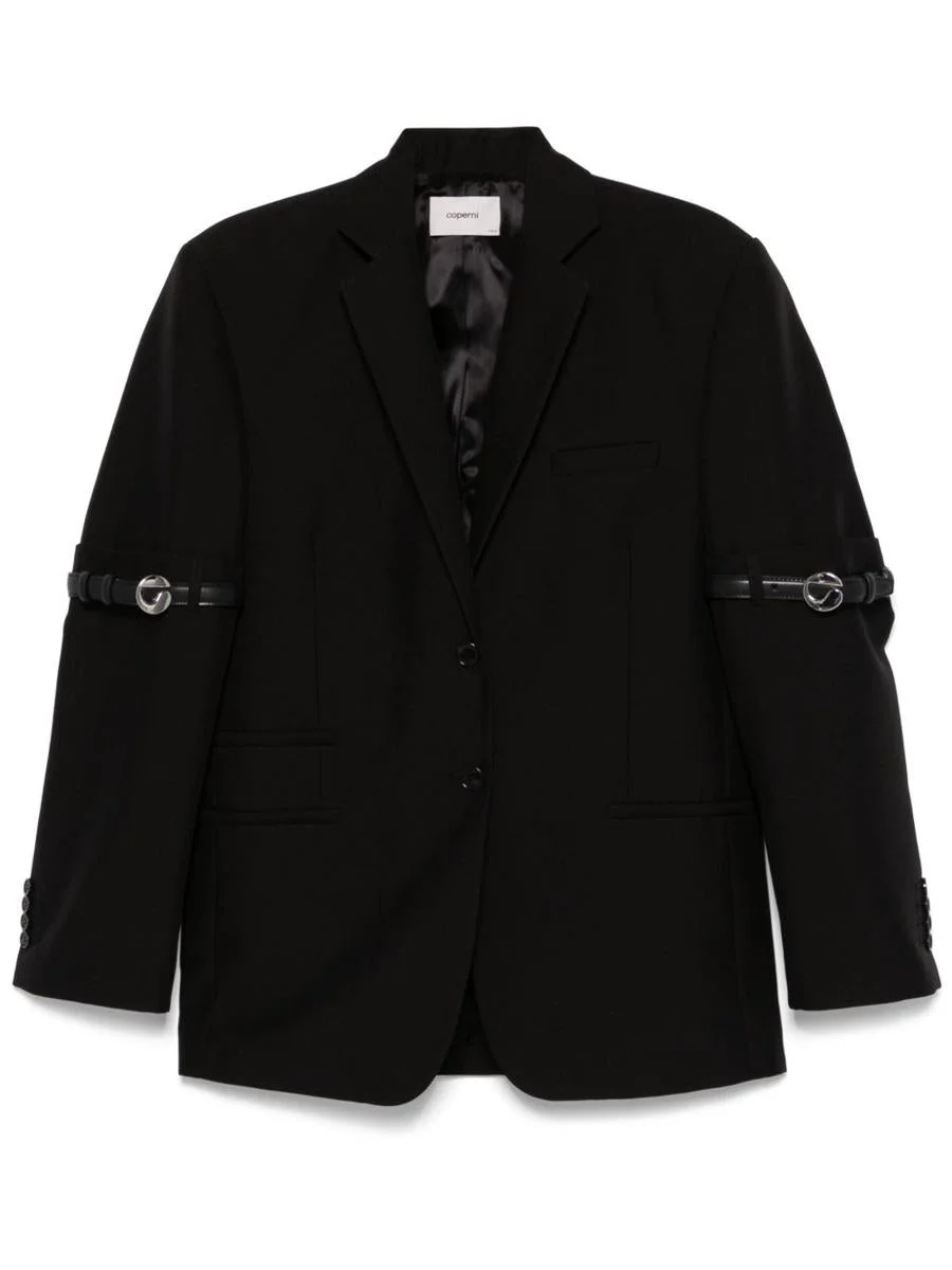 Single-breasted two-button placket Notch lapel Long sleeves, wide structured shoulders; tone-on-tone strap detail at sleeves with silver-toned metal C logo buckles and loops Welt waist pockets, welt ticket pocket, chest pocket Center slit at bottom back Lined Black color 100% Recycled Polyester Made in Portugal Gender: Women Material: 100% RECYCLED POLYESTER Color: Black Made in: Portugal Product ID: COPV37F3004BLK *Import tax/duty will be calculated at checkout (If applicable)