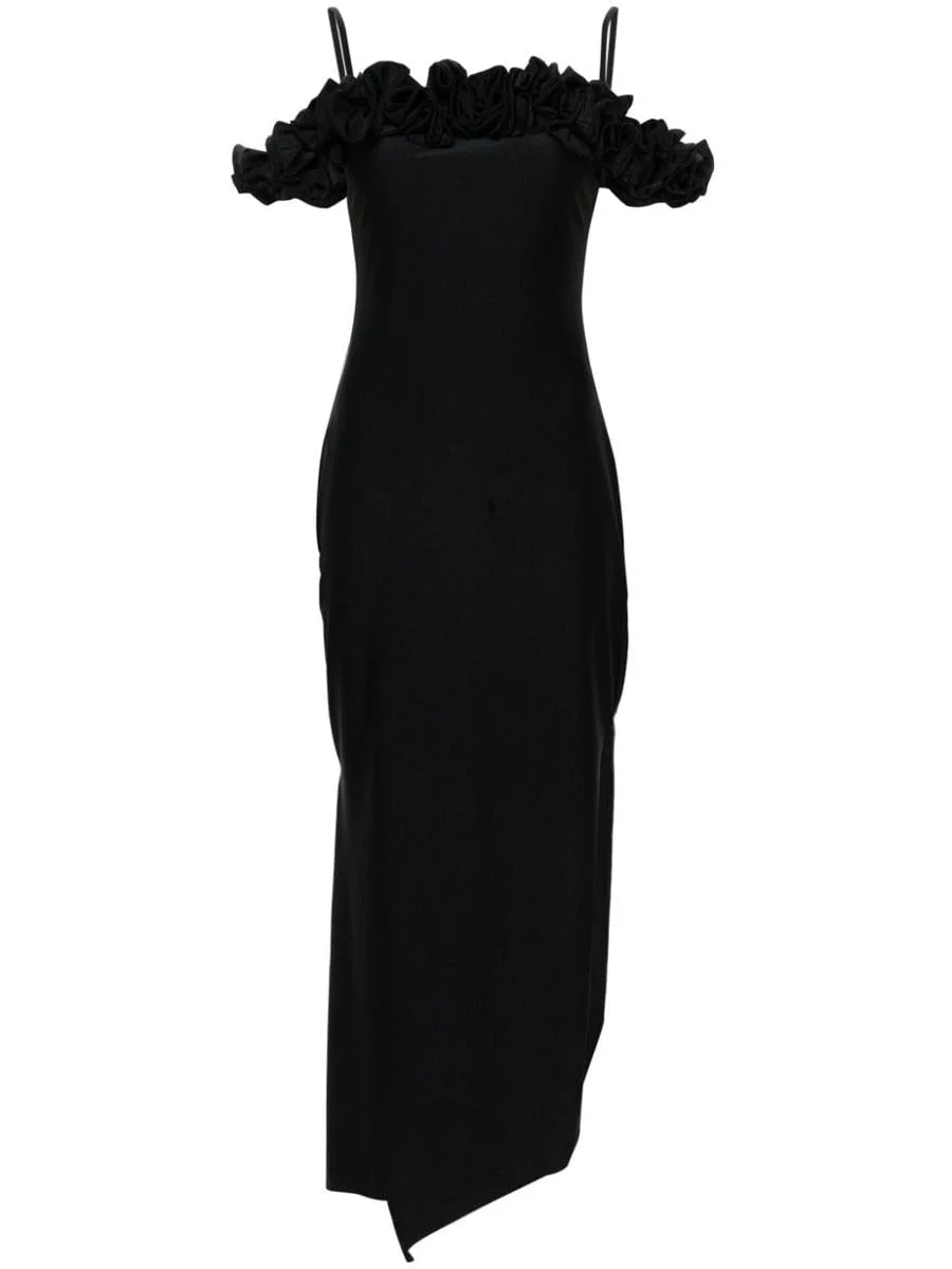 The Coperni Maxi Fitted Dress is made of stretchy technical jersey and features a floral-inspired ruffle application on the off-shoulder neckline. It has thin straps, wide side slits, and an asymmetrical hemline. The model is 177 cm tall and wears size S. Gender: Women Material: 80%POLYAMIDE 20%ELASTANE Color: Black Made in: PT Product ID: COPR113545 BLK *Import tax/duty will be calculated at checkout (If applicable)