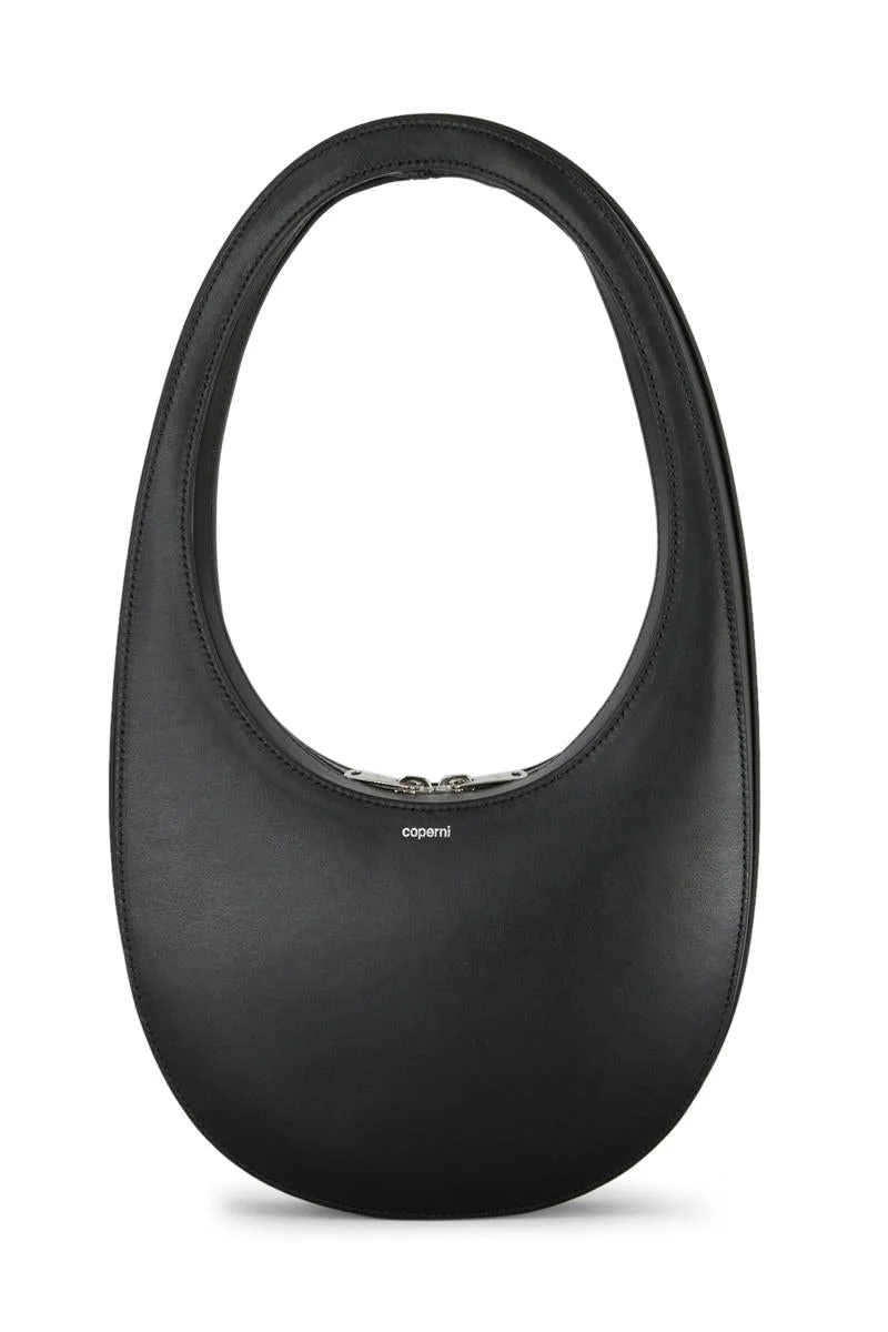 Black leather 'Swipe' bag from Coperni, featuring a double-ended zip closure, tubular handle, and stamped logo. Inspired by the iconic 'swipe to unlock' function of the iPhone, this contemporary oval-shaped bag stands out for its unique and innovative design. It is the must-have of the season, ideal for an elegant and versatile look. Perfect for transitioning from day to night with style, it fits easily under the arm, offering a refined and functional accessory for any occasion SizeAndFit: DEPTH: 5.0 Centimetres HANDLE: 22.0 Centimetres HEIGHT: 15.0 Centimetres WIDTH: 21.0 Centimetres Gender: Women Material: 100% CALF Color: Black Made in: IT Product ID: COPBA01405 BLACK *Import tax/duty will be calculated at checkout (If applicable)