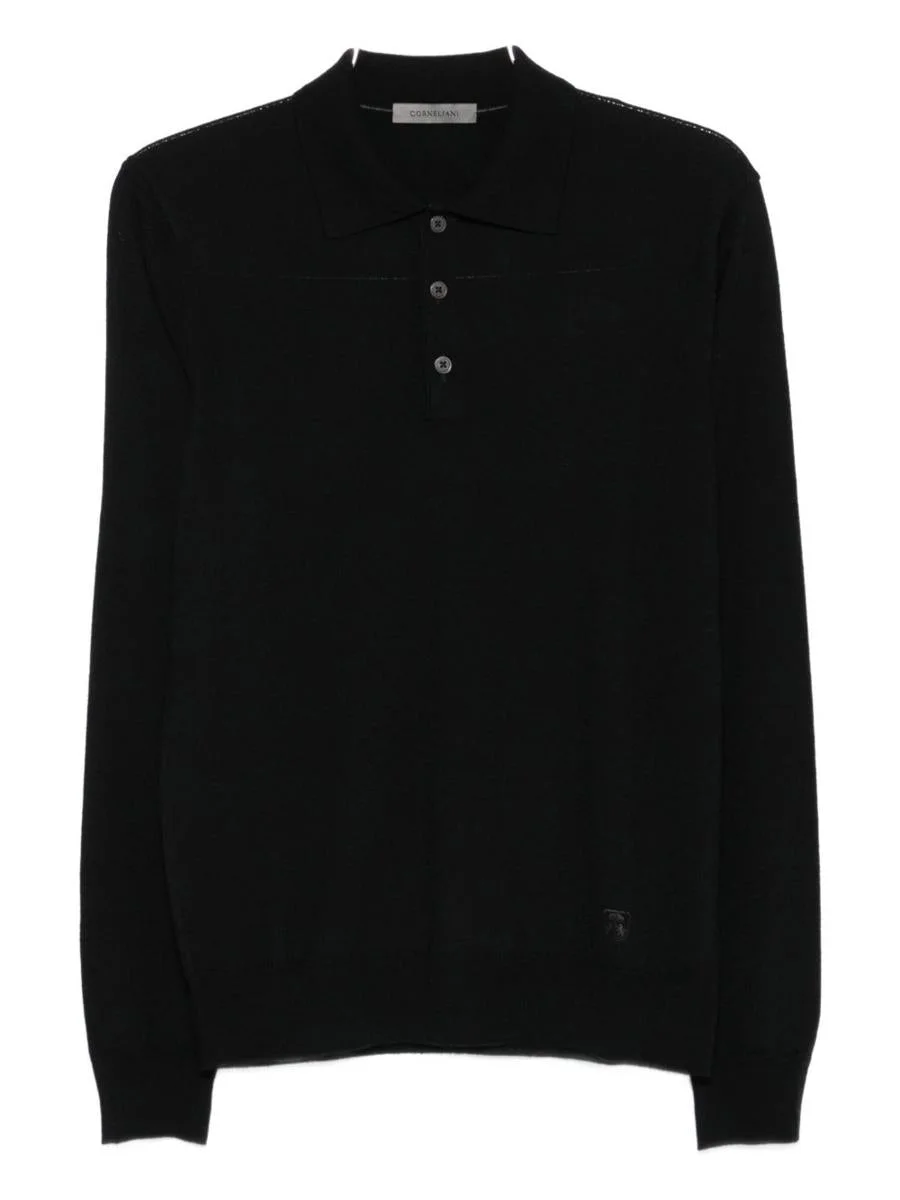 Corneliani Black wool polo shirt with long sleeves, collar, buttons, and embroidered logo. Gender: Men Material: 100% WOOL Color: Black Made in: Italy Product ID: 26M5072625100020 *Import tax/duty will be calculated at checkout (If applicable)