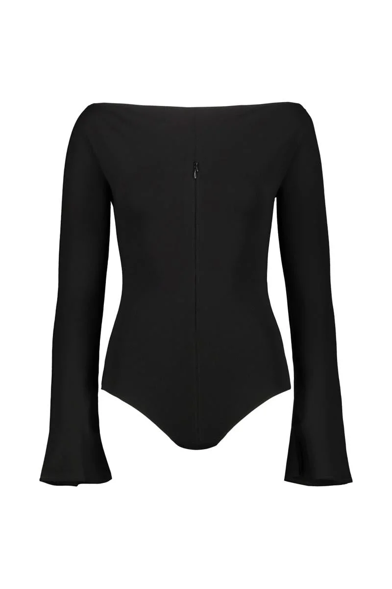 Courreges Boat neck crepe jersey bodysuit, invisible zipper at stomach, long flared sleeves. Gender: Women Material: VISCOSE | 95% VISCOSE, 5% ELASTANE Color: Black Made in: Italy Product ID: 224JBD078JS0066 *Import tax/duty will be calculated at checkout (If applicable)