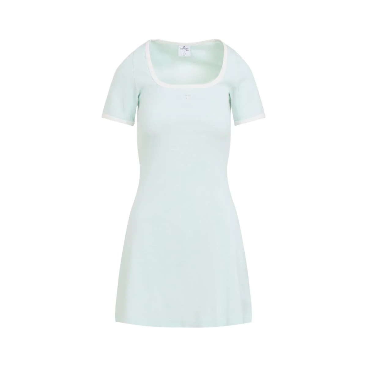 Courreges Light Mint Green Cotton Contrast Dress. Pure light mint green dress, squared white neck, front white patch logo, short sleeves with white edges, mini-length, straight hem. Gender: Women Material: 100%COTTON Color: BLUE Made in: Portugal Product ID: 126JRO776JS0203_216 *Import tax/duty will be calculated at checkout (If applicable)