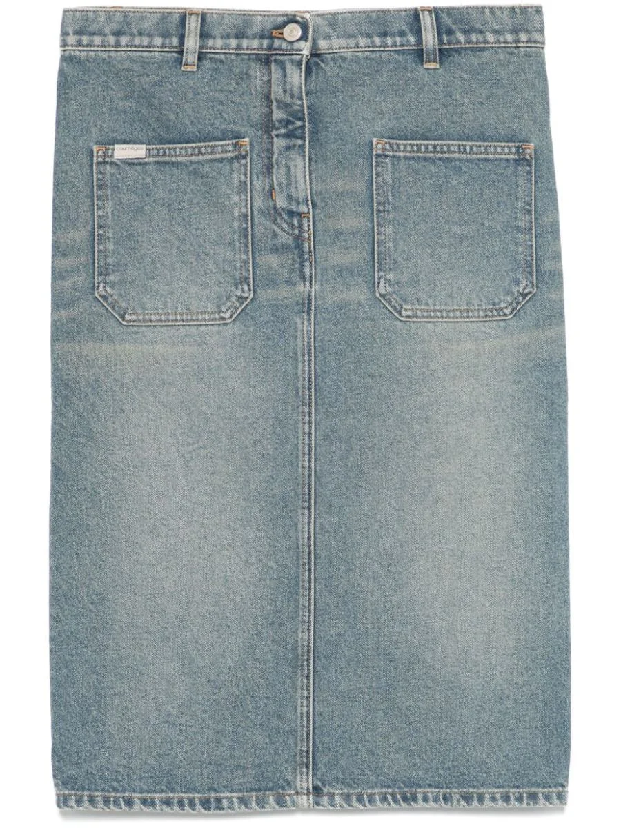 indigo blue cotton washed denim front button and zip fastening belt loops two front patch pockets two rear patch pockets bias cut pencil silhouette straight hem below-knee length Gender: Women Material: COTTON 100% Color: MEDIUM BLUE Made in: Italy Product ID: 324DJU183DE0033 7052 *Import tax/duty will be calculated at checkout (If applicable)