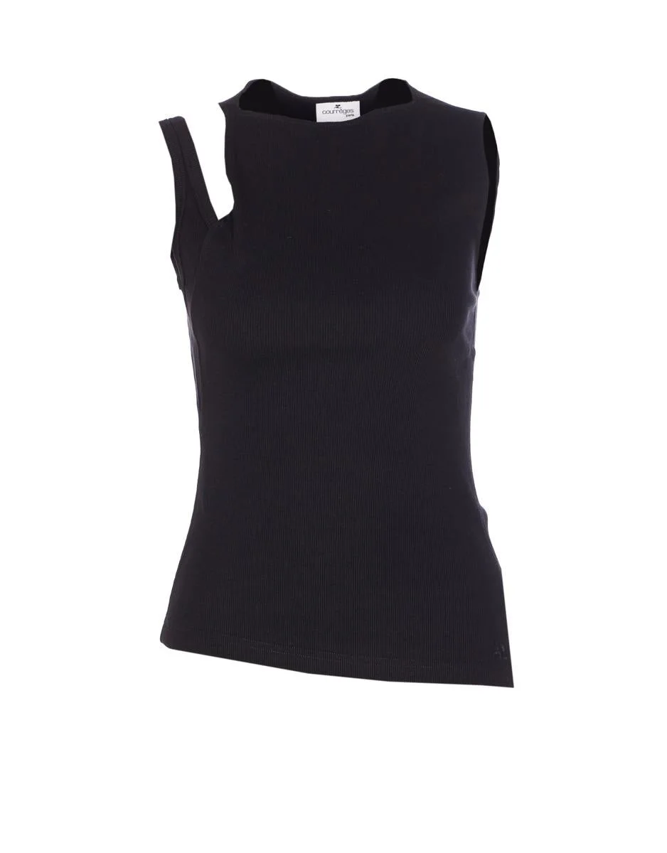 Courreges Black Top, Crewneck, Sleeveless, Asymmetrical Model, Embroidered Logo, US SIZE Gender: Women Material: 88%COTTON, 10%POLYURETHANE,2%ELASTANE, 100% CUPRO Color: Black Made in: Romania Product ID: 425JDE146JS01949999 *Import tax/duty will be calculated at checkout (If applicable)