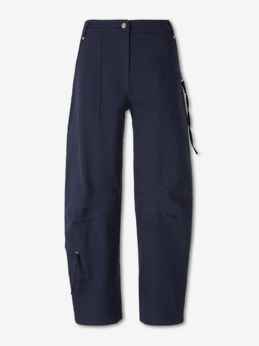 Cargo Pants EwaPants By Cult Gaia• Features multiple pockets at the front, back, and bottom• High waist with belt loops• Tone-on-tone stitching and darts at the knees• Loose fit• Made from cotton twill• Wide Pants• Barrel style• Front zipper and button closureComposition: 98% cotton, 2% elastaneItaly Gender: Women Material: 98% COTTON, 2% ELASTANE Color: NAVY BLUE Made in: Italy Product ID: PT28759CO3199_DEEPLAKEDEEPLAKE *Import tax/duty will be calculated at checkout (If applicable)