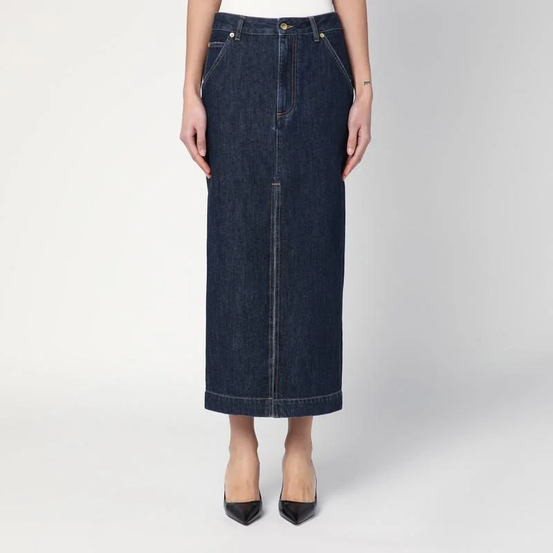 Blue cotton denim midi skirt from DARKPARK featuring a front zip and button fastening, waist loops, a front slit, a classic five pocket design and a back logo patch. Gender: Women Material: Fabric I: 100% Cotton / Pocket lining: 65% Polyester - 35% Cotton Color: BLUE Made in: Italy Product ID: WSK02DBL030055/Q_DARKP-0055 *Import tax/duty will be calculated at checkout (If applicable)