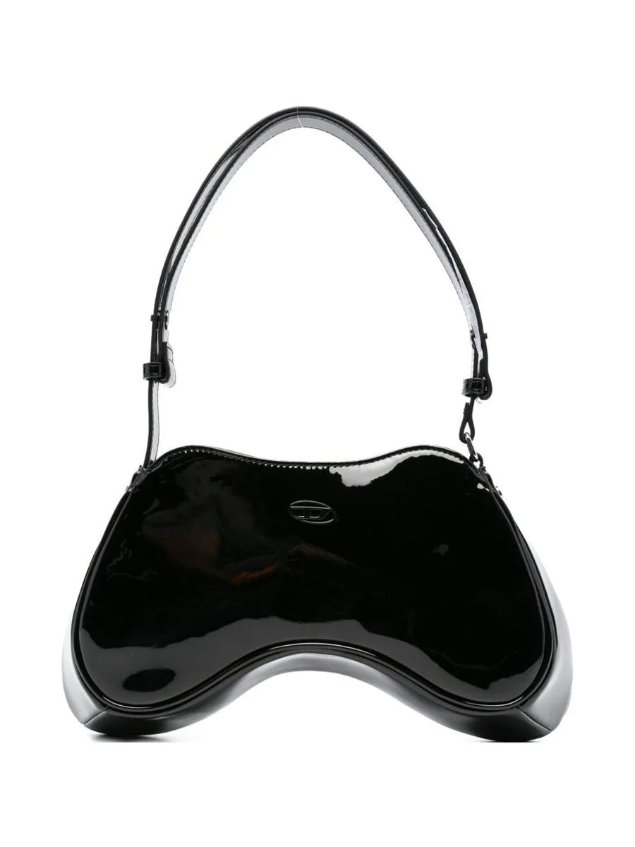 Diesel 'Play' shoulder bag with black glossy finish SizeAndFit: Depth 8 cm Height 16 cm Width 31 cm Gender: Women Material: .100% POLYURETHANE Color: Black Made in: Imported Product ID: X10201 P6255 HA881 *Import tax/duty will be calculated at checkout (If applicable)