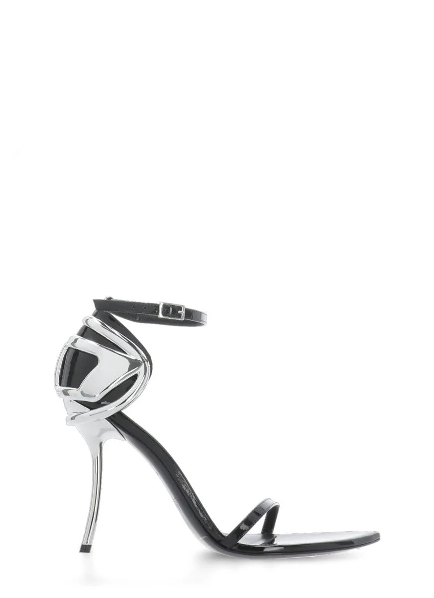 - Black Diesel heeled sandals for woman - Arrow toe - Rear contrasting color logo details - Ankle strap - Stiletto heel: 10 cm Shoe runs true to size Gender: Women Material: 100% COW LEATHER Color: Black Made in: Italy Product ID: Y03662P4347H1145 *Import tax/duty will be calculated at checkout (If applicable)