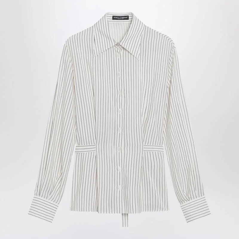 White cotton and silk shirt by Dolce & Gabbana with pinstripe pattern, featuring long sleeves with buttoned cuffs, pointed collar, front buttoning, and a waist detail with a tie belt at the back. Gender: Women Material: 52% Cotton - 48% Silk Color: WHITE Made in: Italy Product ID: F5T69TFBTAL/R_DOLCE-S8051 *Import tax/duty will be calculated at checkout (If applicable)