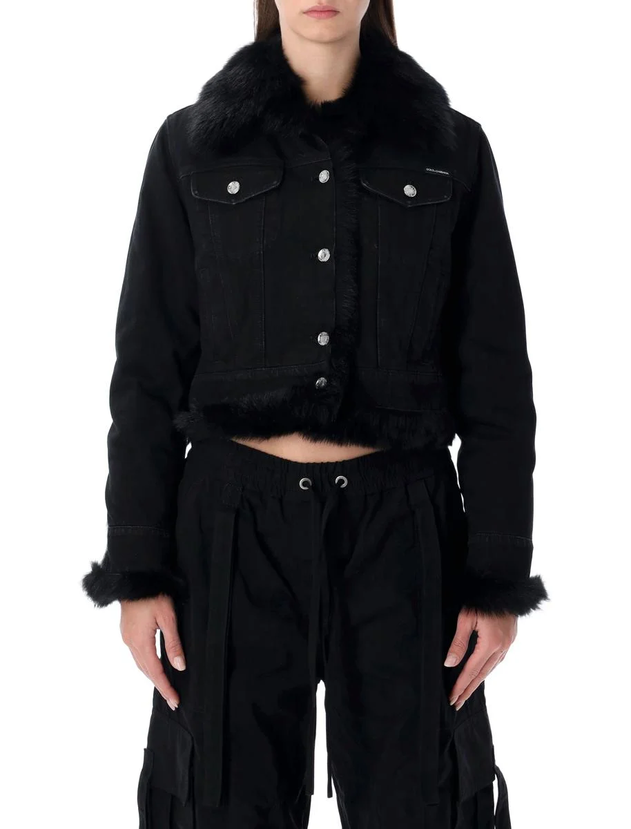 Part of the Fall/Winter 2025 Collection, this Dolce & Gabbana jacket redefines denim with an elegant twist. Crafted from black cotton, it features a soft faux fur lining and matching collar for added warmth and texture. The cropped silhouette, tonal trims and metallic button closure make it a versatile statement piece for refined yet contemporary looks. Black cotton denim fabric Tonal fur lining and collar Front button closure Chest flap pockets with buttons Fur cuffs and hem Back metal logo placket Cropped design Alessandra is 1,75 m and wears size 42 Gender: Women Material: 100% COTTON LINING 70% LAMB 30% VISCOSE Color: Black Made in: Italy Product ID: 25AF9S97ZG8OD8#S9001 *Import tax/duty will be calculated at checkout (If applicable)