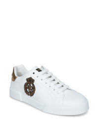 White leather sneakers. Golden lion patch detail. Metallic gold heel. These luxurious Dolce & Gabbana Portofino sneakers feature a sophisticated golden lion patch, adding a regal touch to the sleek design. Perfect for elegant yet casual attire, they are distinguished by a gold heel that elegantly reflects light. Gender: Men Material: 100%CALF LEATHER Color: WHITE Made in: Imported Product ID: CS2330 AH136 8I047 *Import tax/duty will be calculated at checkout (If applicable)