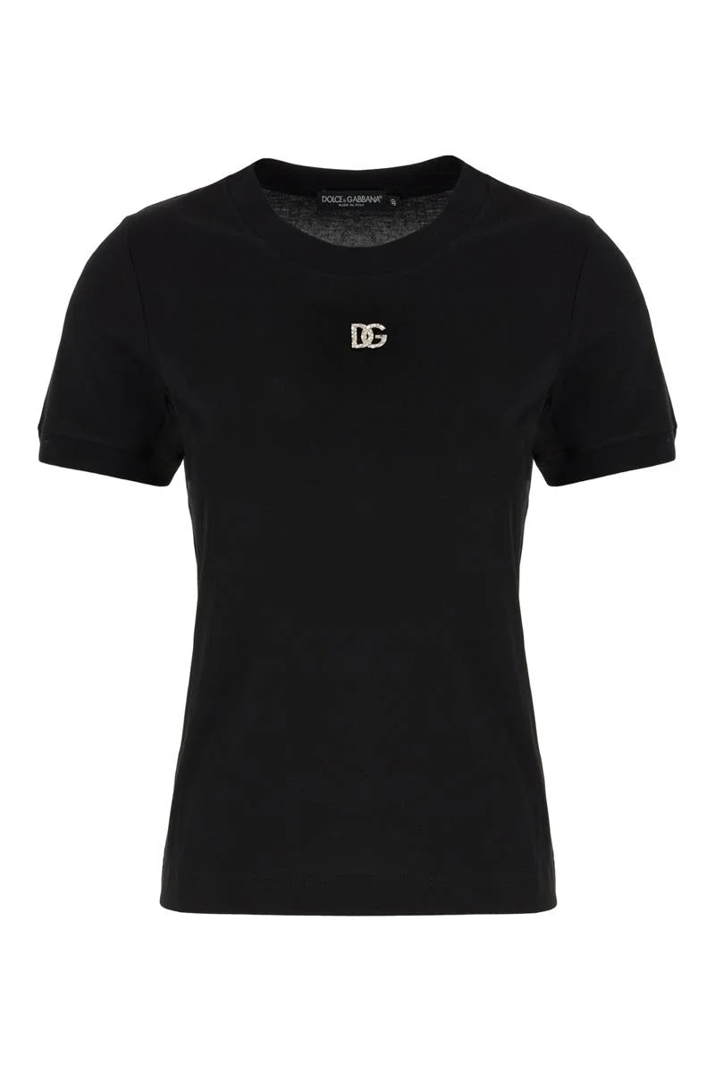 Black T-shirt. Short sleeves. Crew neck. Jeweled DG logo on front. Gender: Women Material: 100% COTTON Color: Black Made in: IT Product ID: F8N08ZG7B3U N0000 *Import tax/duty will be calculated at checkout (If applicable)