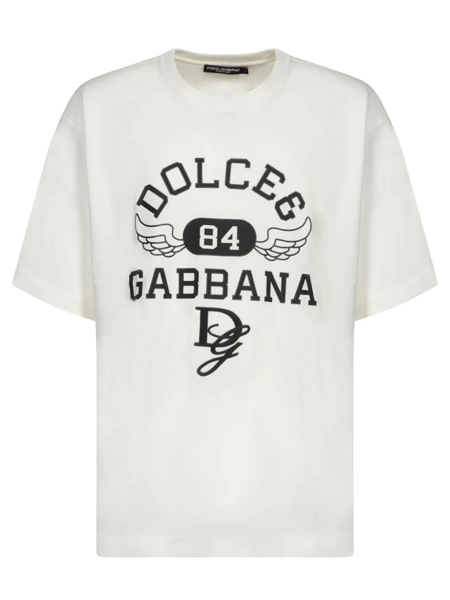 Short sleeves, crew neck, frontal graphic logo.. This white t-shirt features the distinctive Dolce & Gabbana logo at the center, framed by elegant vintage-inspired graphic details. Crafted from soft cotton, it promises comfort and style at every hour of the day Gender: Men Material: 100%COTTON Color: WHITE Made in: Imported Product ID: G8PN9Z G7NSN W0111 *Import tax/duty will be calculated at checkout (If applicable)